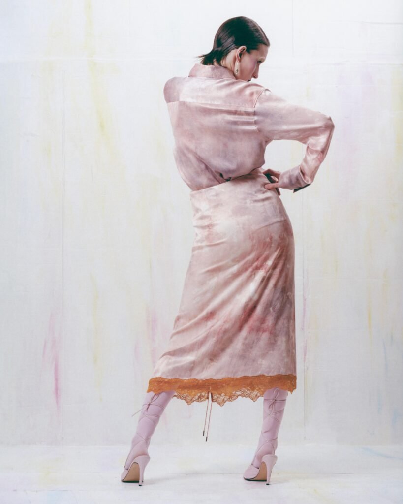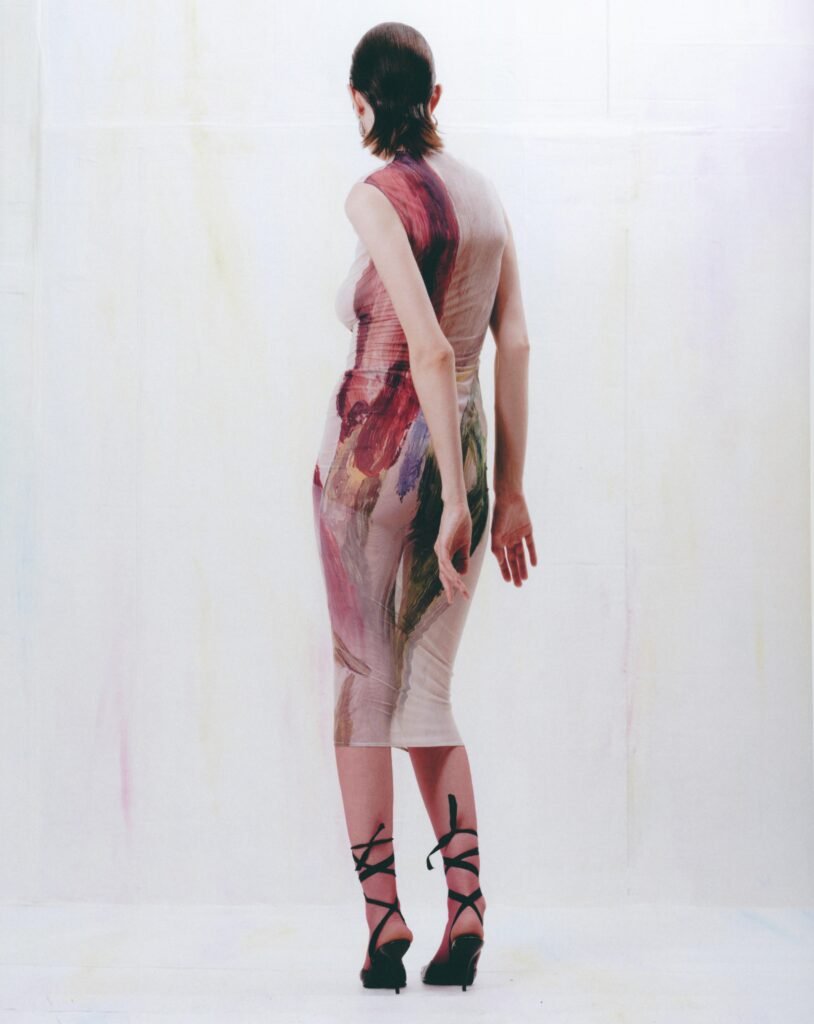 Fluid lines, delicate lingerie, and textured details play with contrasts. The color palette reflects O’Keeffe’s iconic shades nude, cream, smoky rose, and deep vermilion, enhancing movement and celebrating the skin.