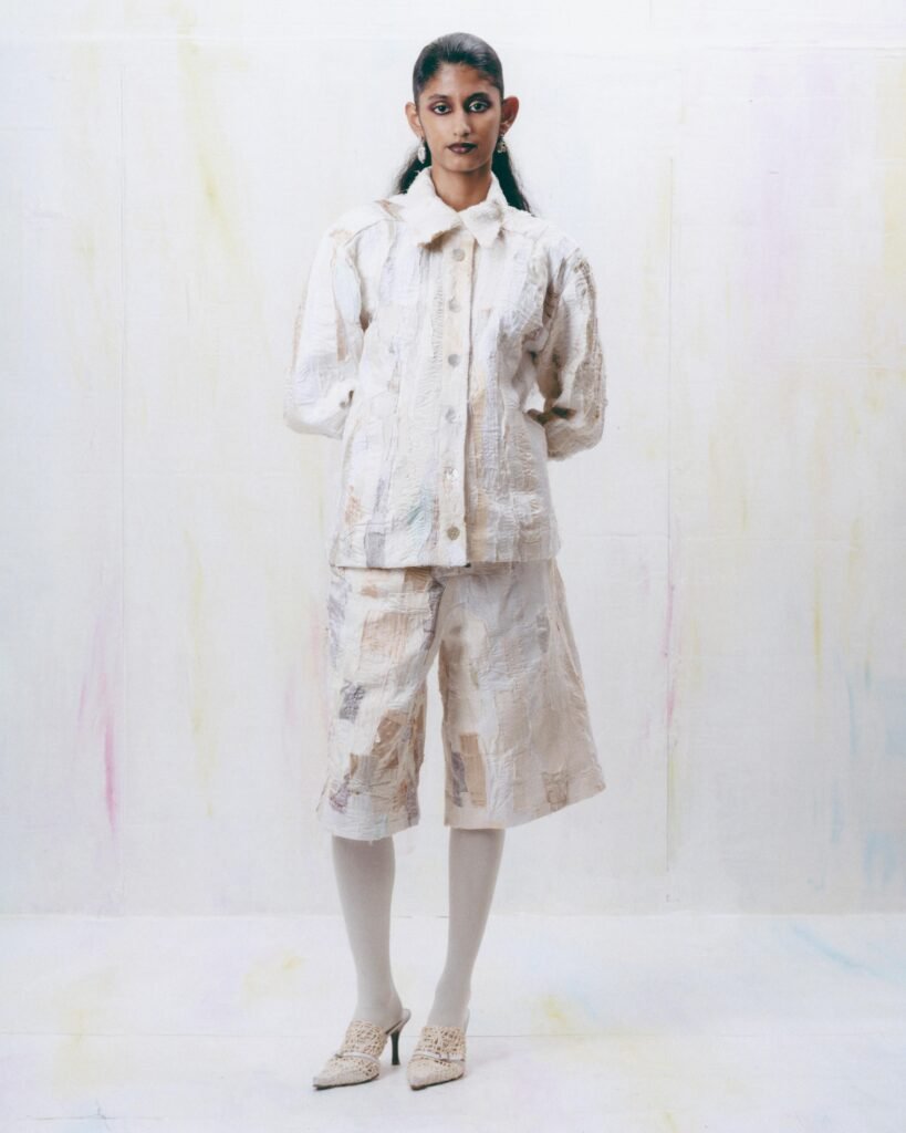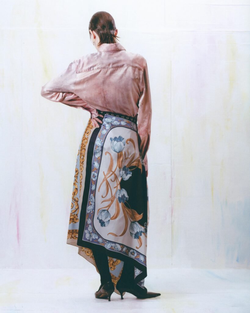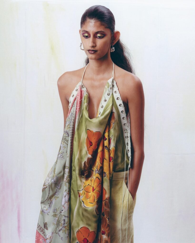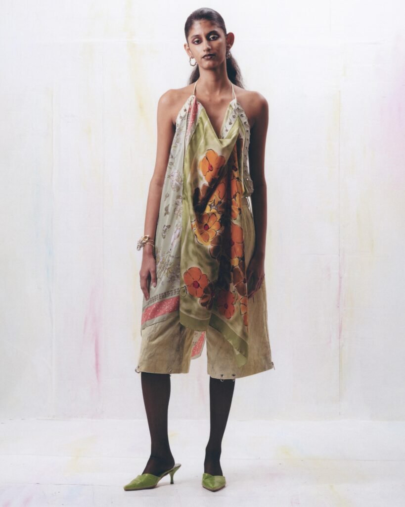The arum, symbol of the season, embodies the collection’s duality: fragile yet powerful, intimate yet bold. Through recycled patchworks, reimagined scarves, and vintage lace, RAPPAZ continues its commitment to sustainable, one-of-a-kind creations.