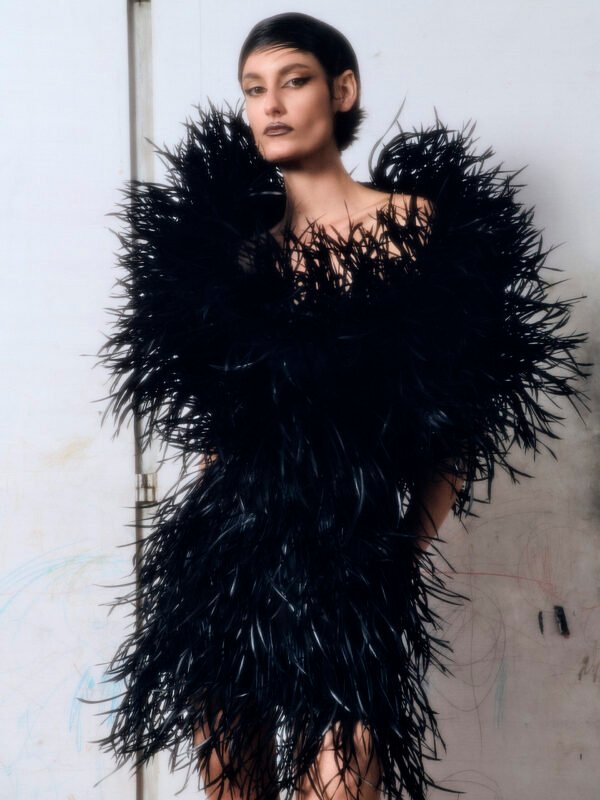 SHORT CORSET DRESS IN UPCYCLED GOOSE FEATHERS