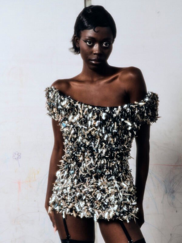 This short corset dress features upcycled black goose feather embroidery. It is lined with yellow cotton batiste sourced from surplus stock, as well as black viscose lining, also derived from surplus materials. The dress is fastened with lacing at the center back, complete with visible silver eyelets.