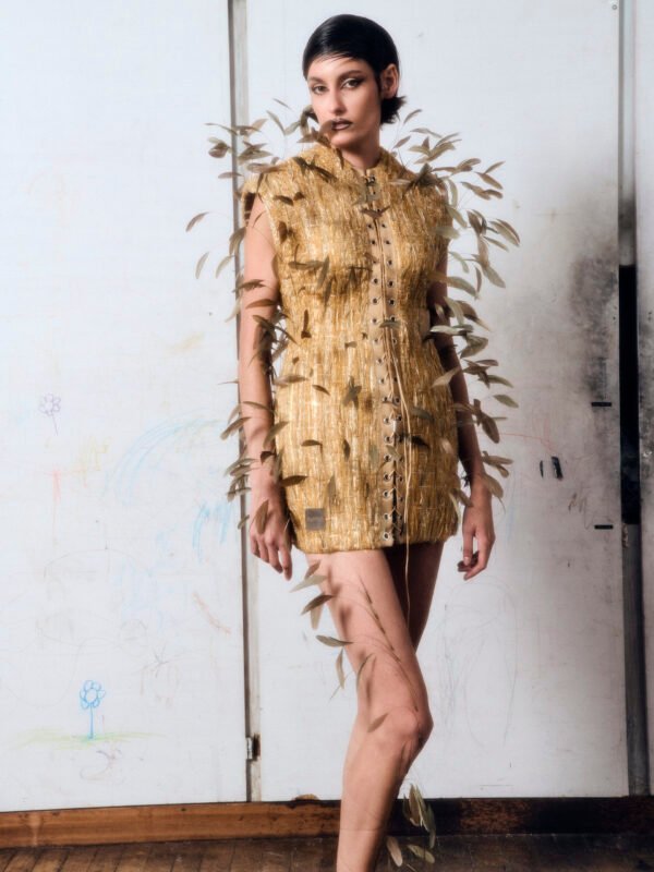 This short corset dress features yellow thread embroidery sourced from surplus materials and green rooster feathers. It is lined with yellow cotton batiste, also derived from surplus stock. The dress is fastened with lacing at the center back, complete with visible silver eyelets.