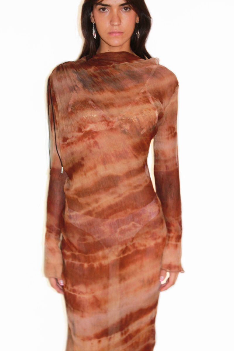 720,00 € inc. VatThis draped tube dress is made from silk crepe gauze sourced from a dormant stock company, with a unique print created by hand using natural dyes. Each print is unique, guaranteeing exclusivity. The black mother-of-pearl buttons are sourced from surplus materials.