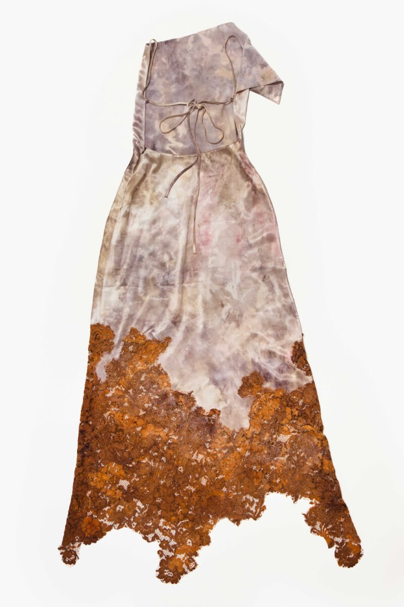 1 150,00 € inc. VatThis asymmetrical slip dress is made from viscose satin fabric sourced from a dormant stock company. It features a unique purple print and brown lace, hand-dyed using natural dyes. Each print is unique, guaranteeing the exclusivity of the product.