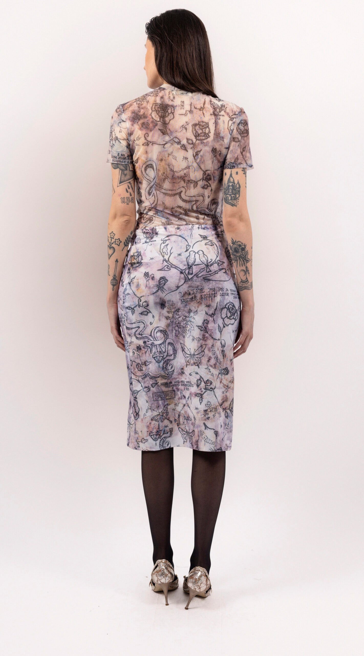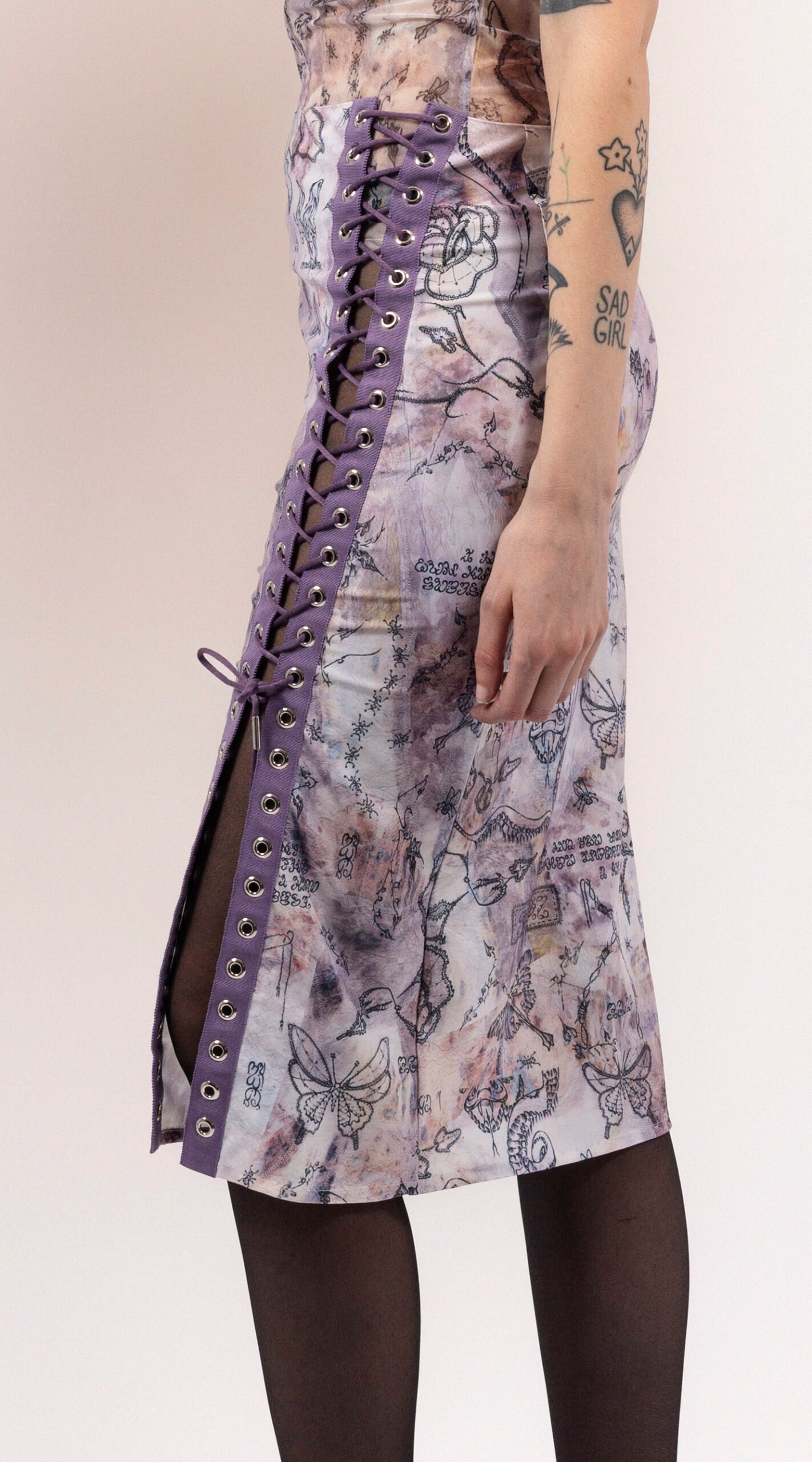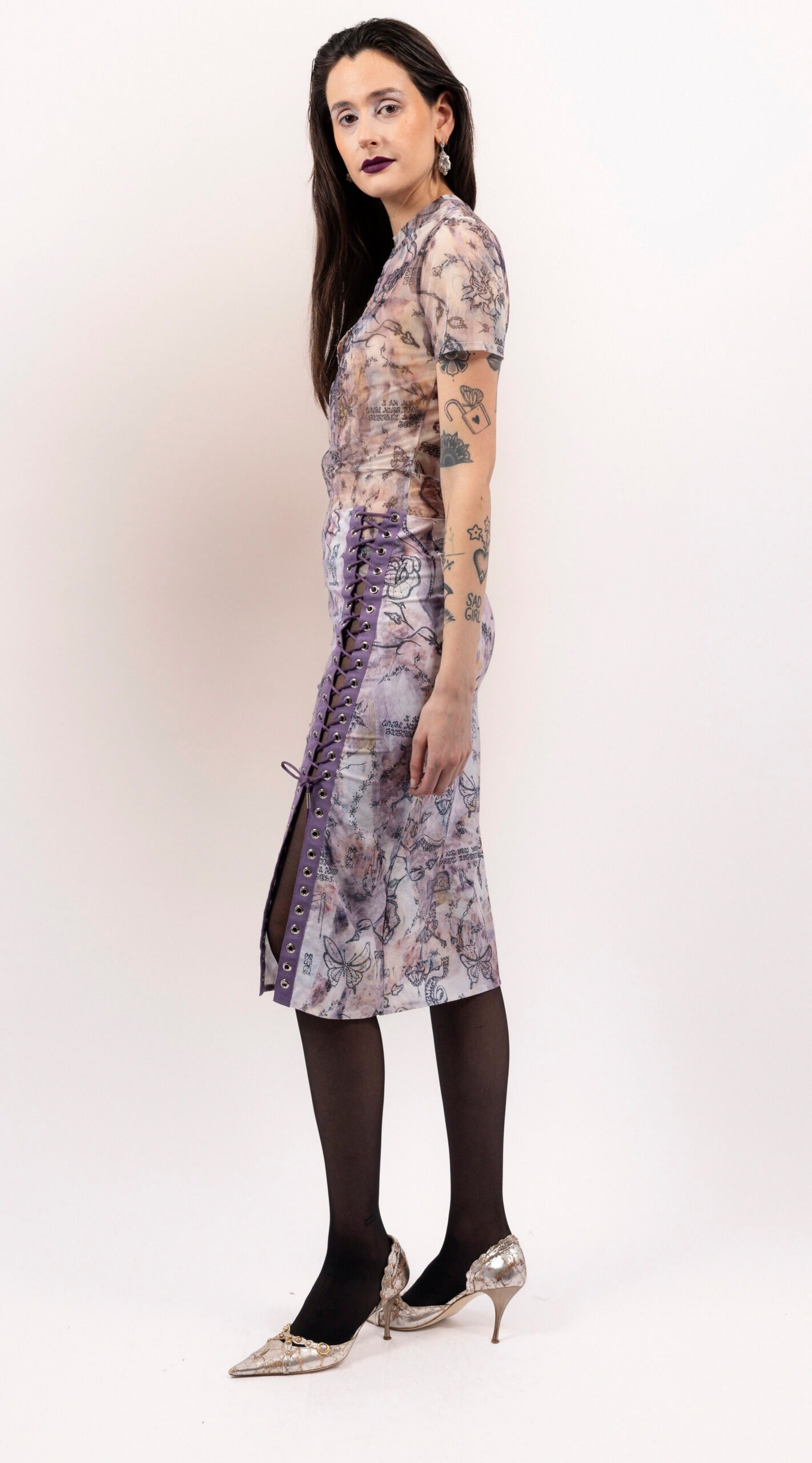 a tattoo-inspired motif on a marbled background. A front lace-up detail with purple grosgrain trim and eye- lets adds an elegant touch. The skirt fastens with an invisible zipper on the left side.