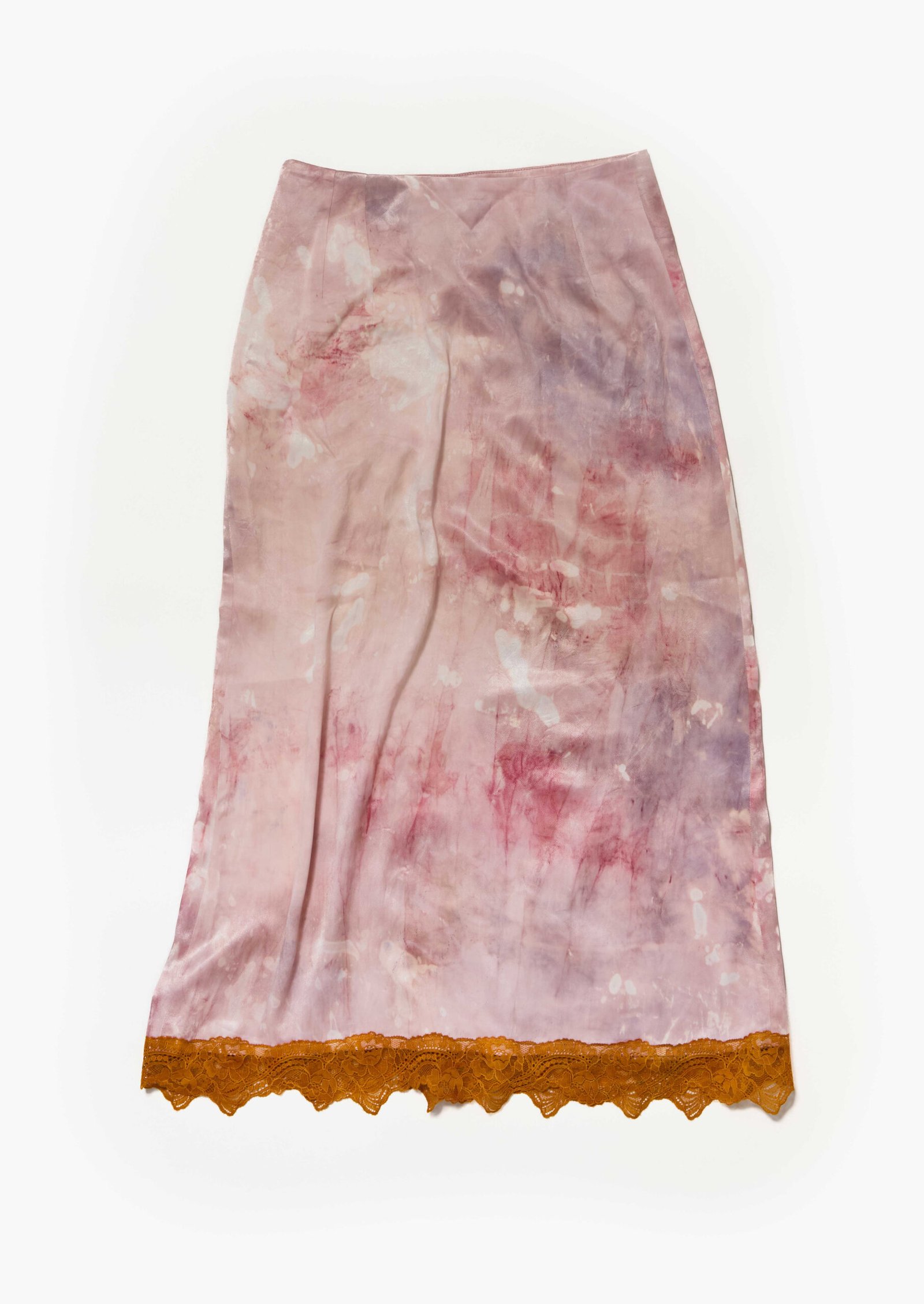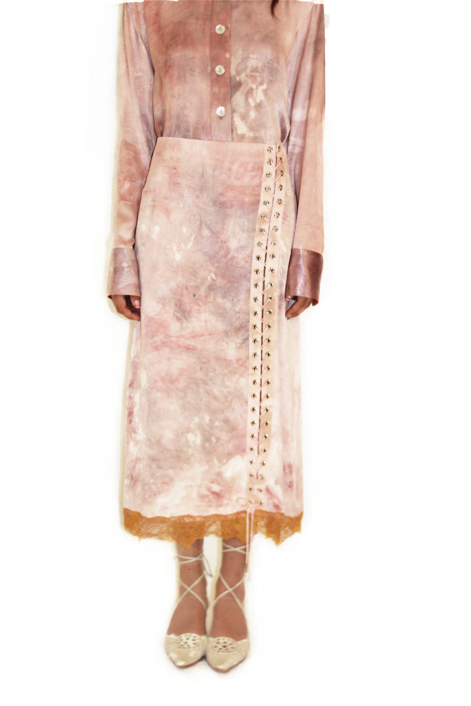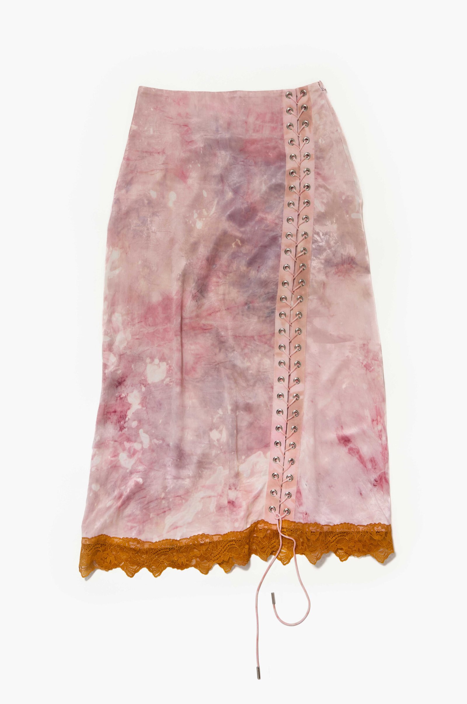This skirt is made from viscose sourced from a dormant stock company, featuring a unique pink print created by hand using natural dyes, edged with orange lace and lacing detail at the front. Each print is unique, guaranteeing exclusivity.