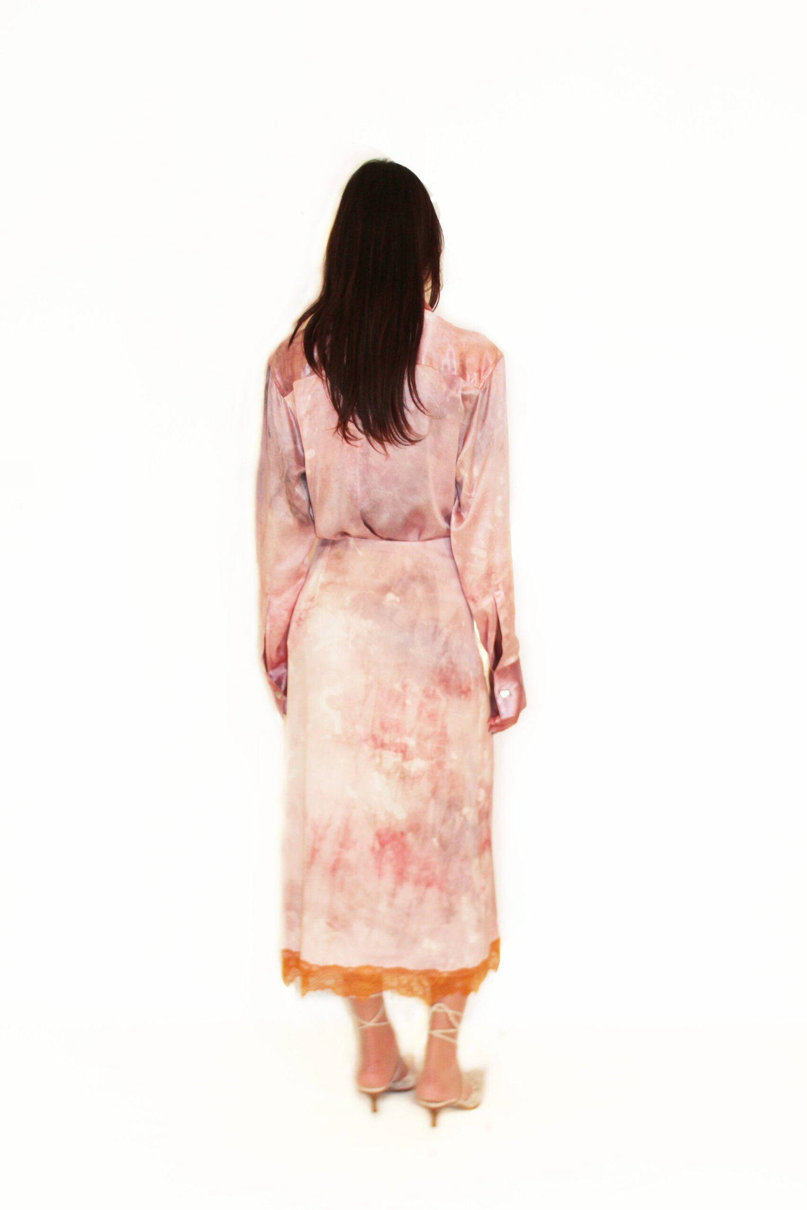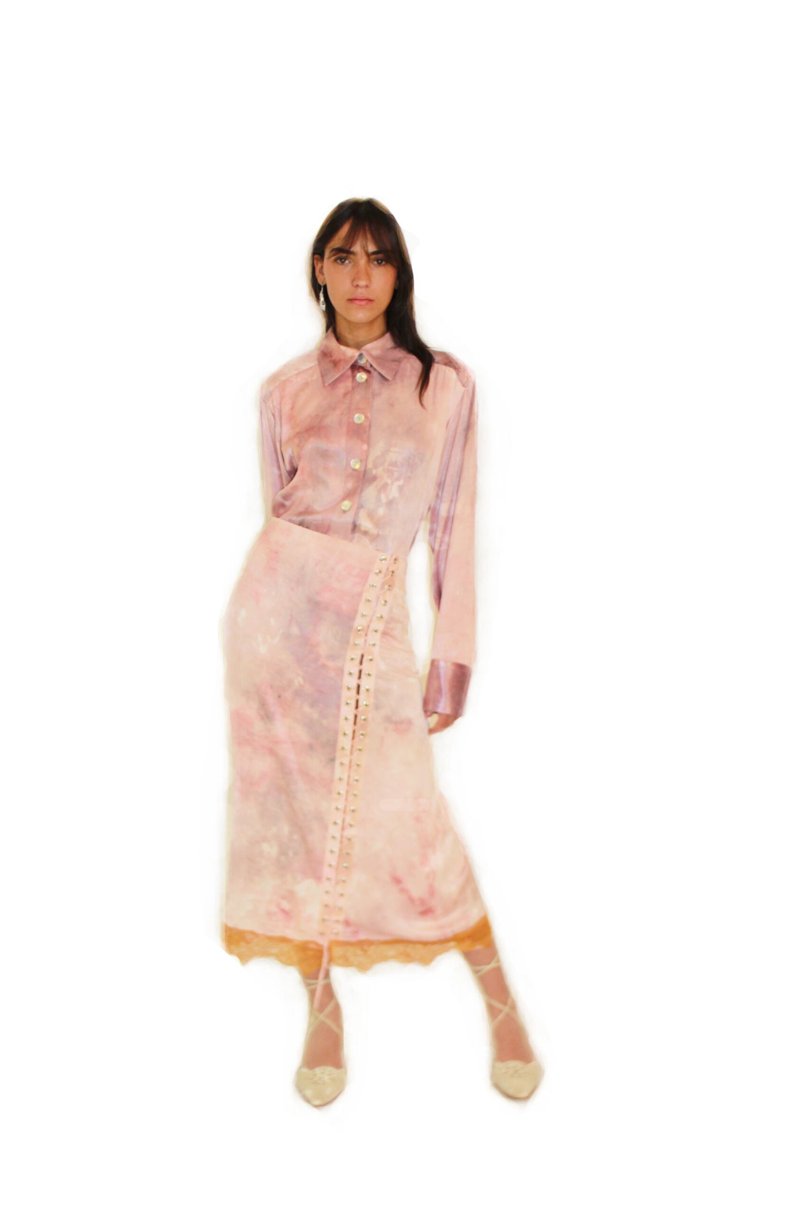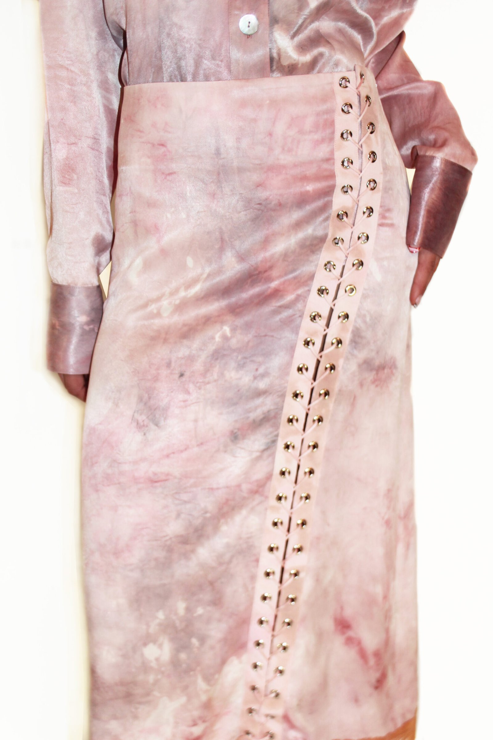 This skirt is made from viscose sourced from a dormant stock company, featuring a unique pink print created by hand using natural dyes, edged with orange lace and lacing detail at the front. Each print is unique, guaranteeing exclusivity.
