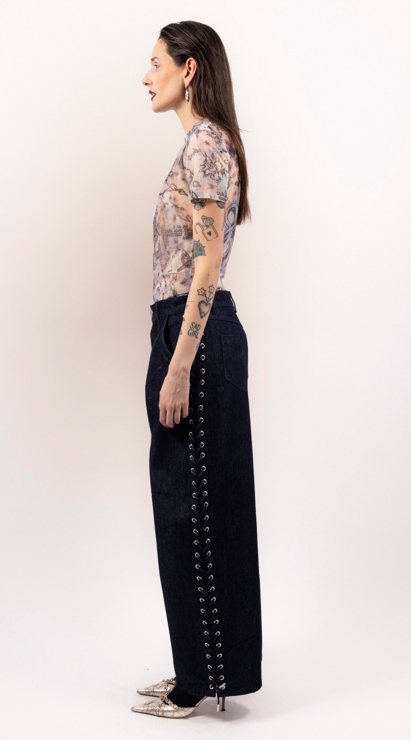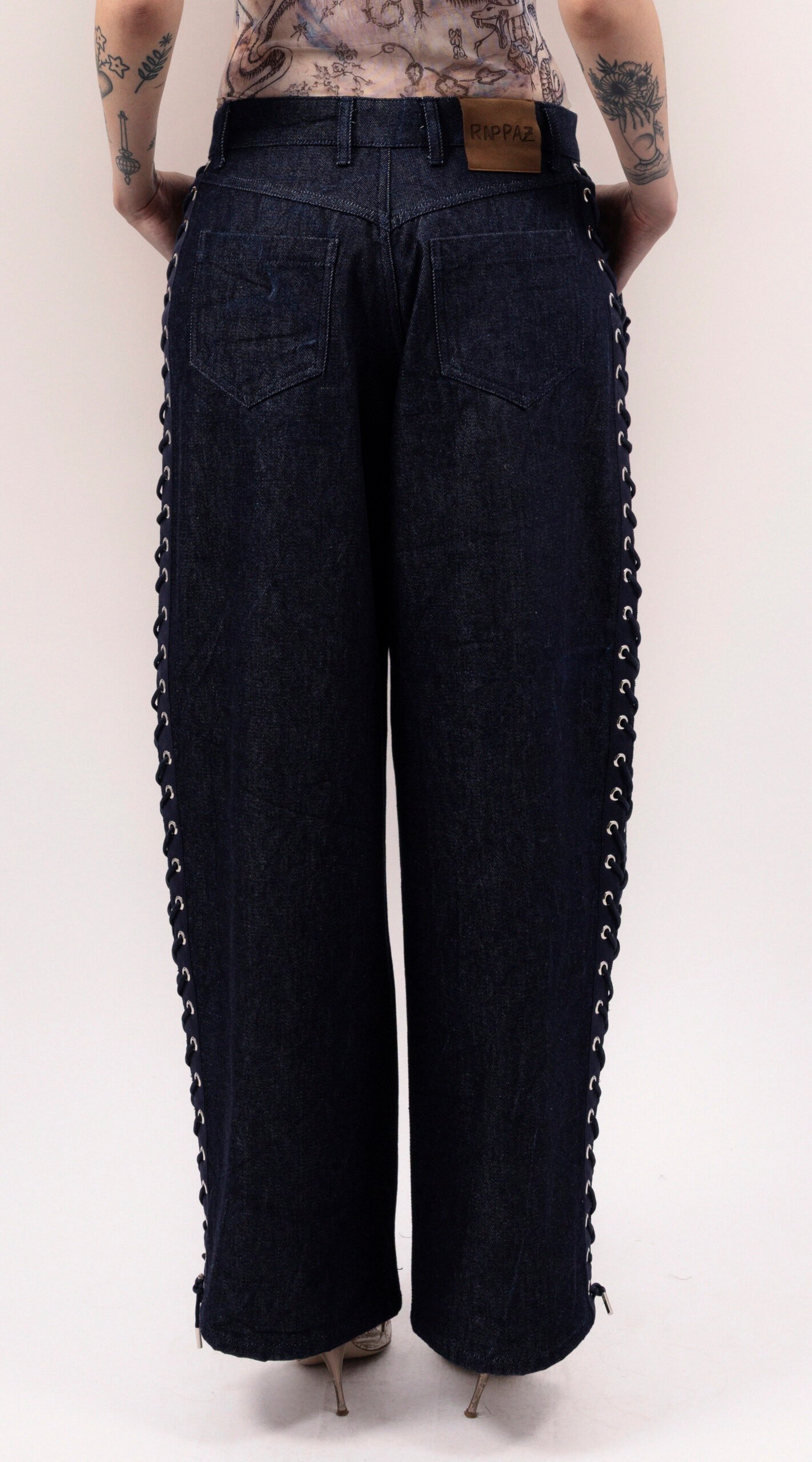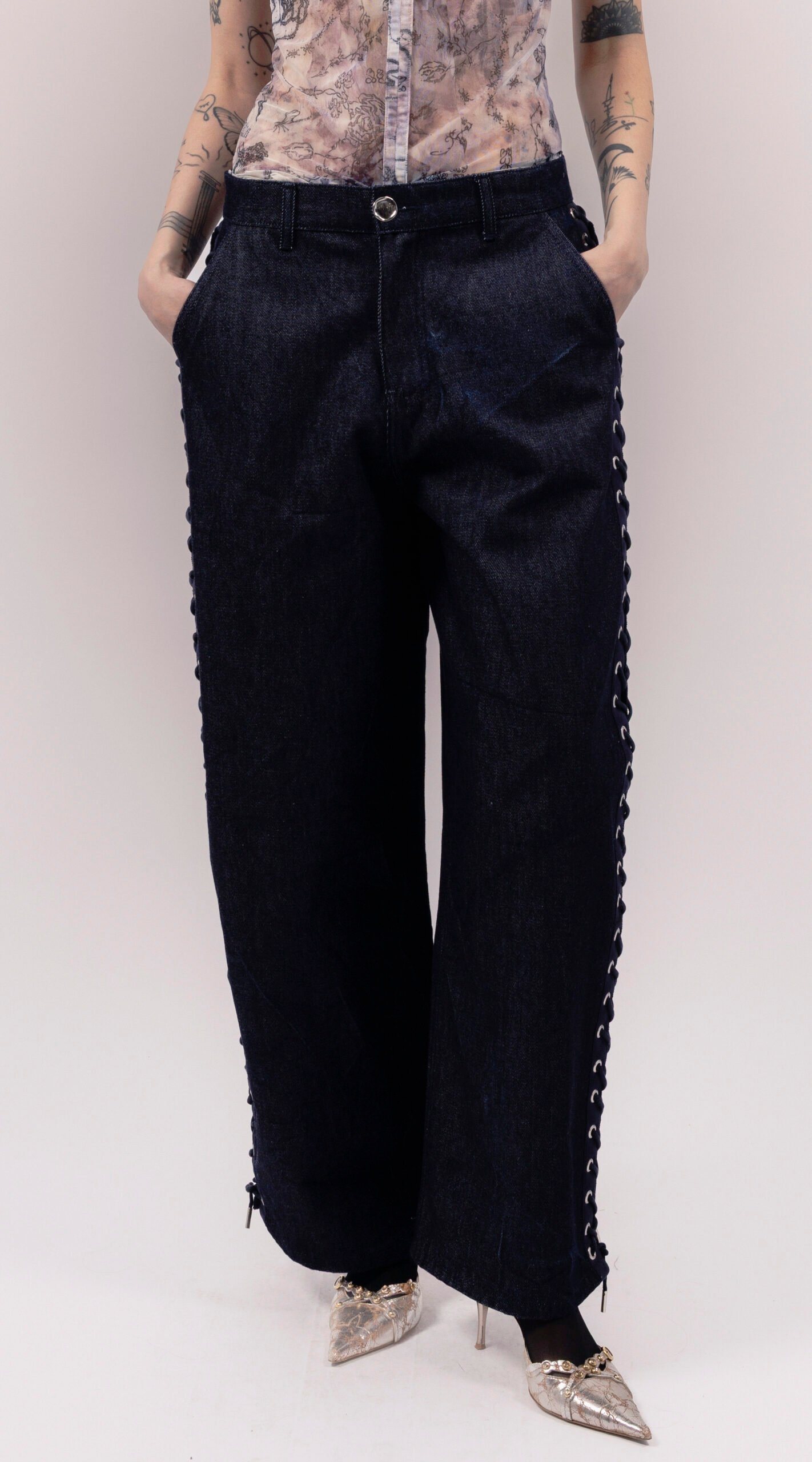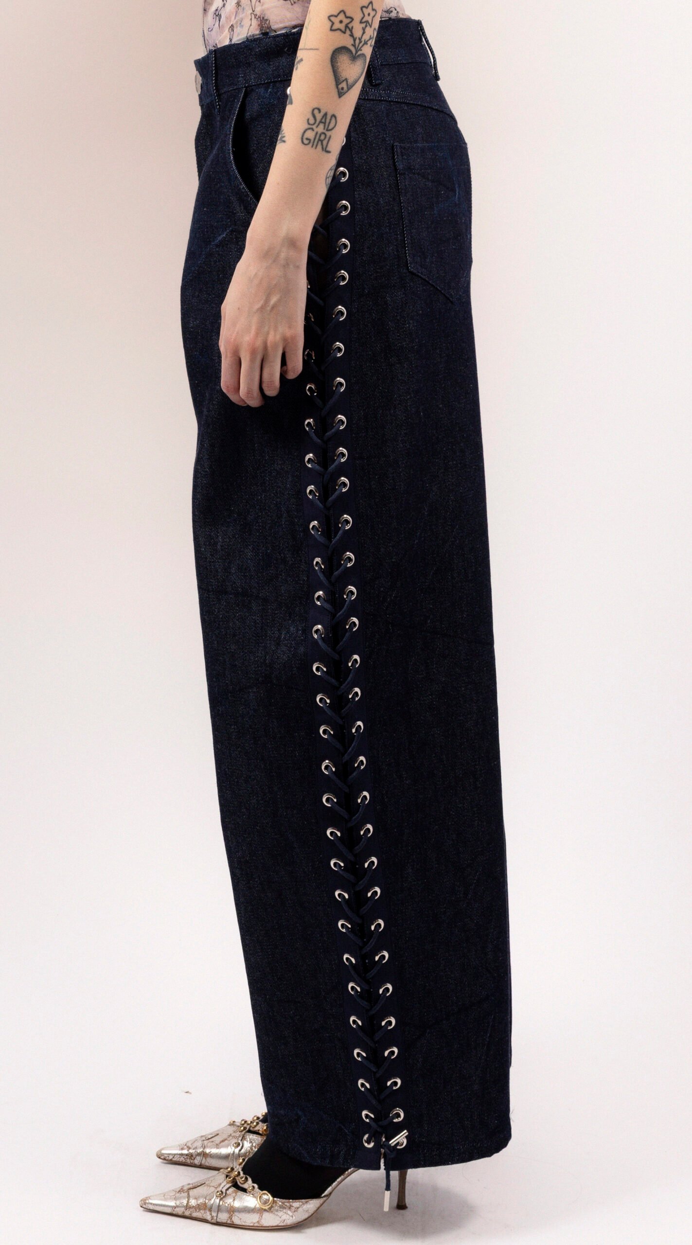 Wide-leg trousers crafted from heavyweight denim, featuring a side grosgrain lace-up in navy with eyelets. The trousers have a straight waistband with belt loops, tailored front pockets, and patch pockets at the back. They fasten with a zipper and an irregular silver-tone metal button.