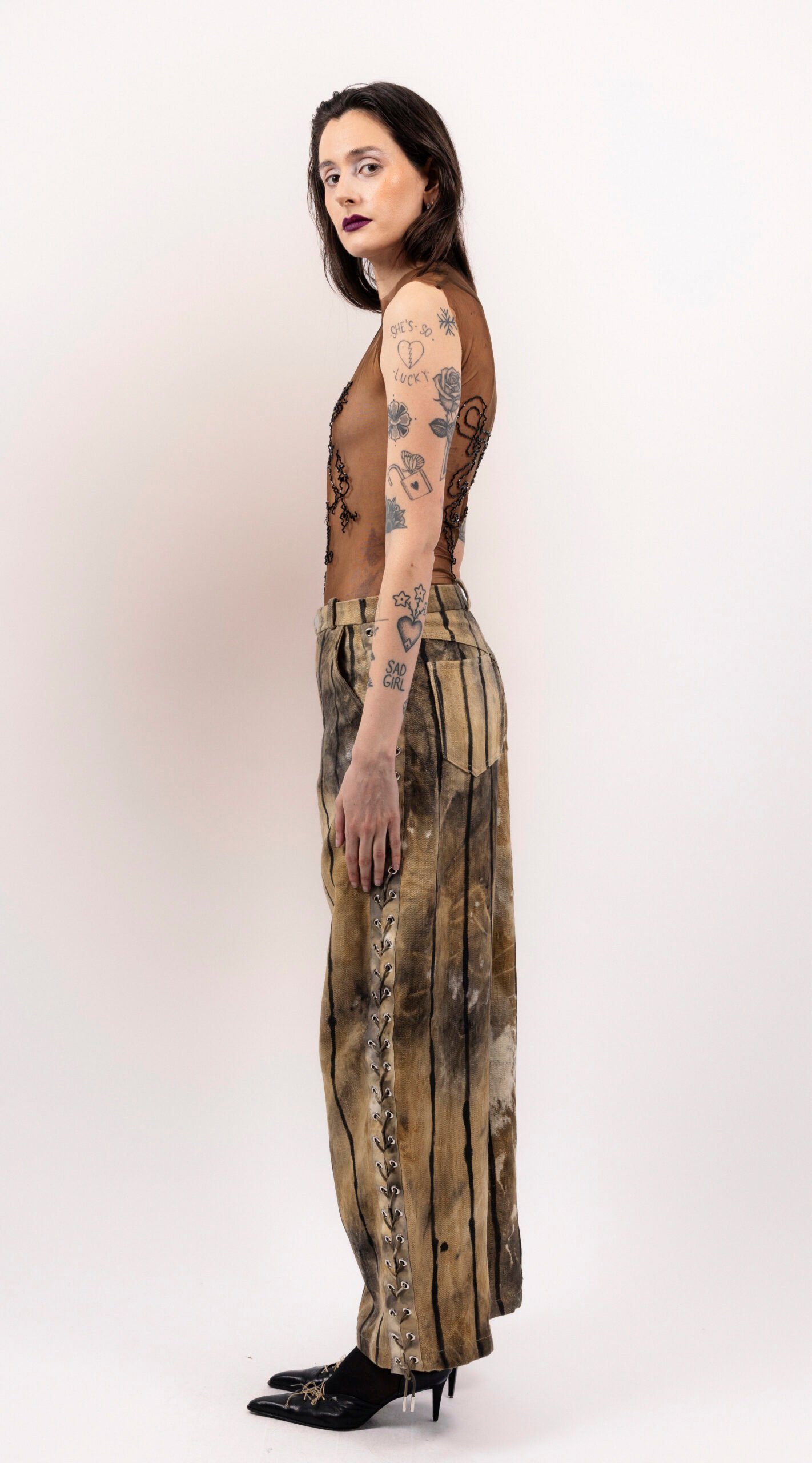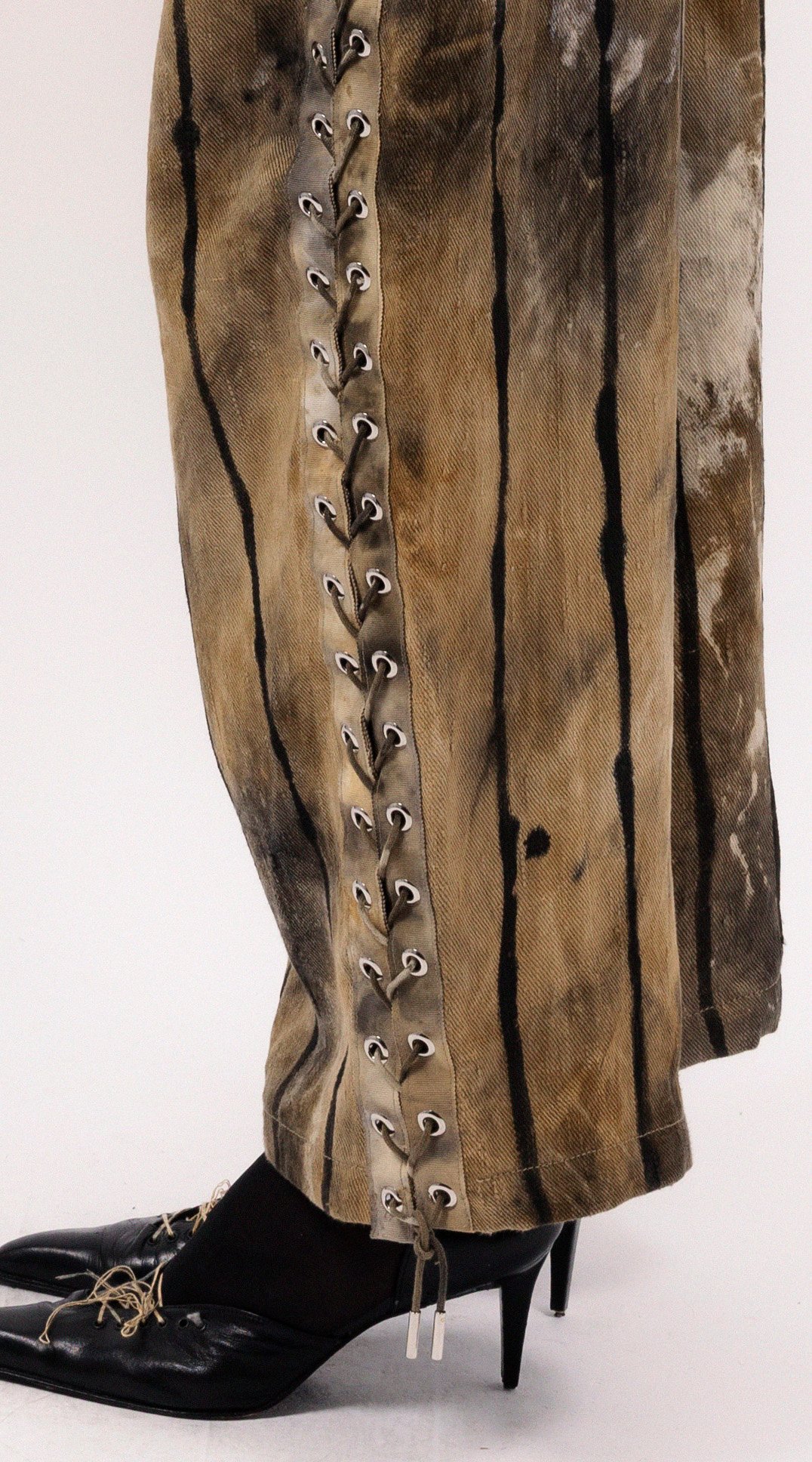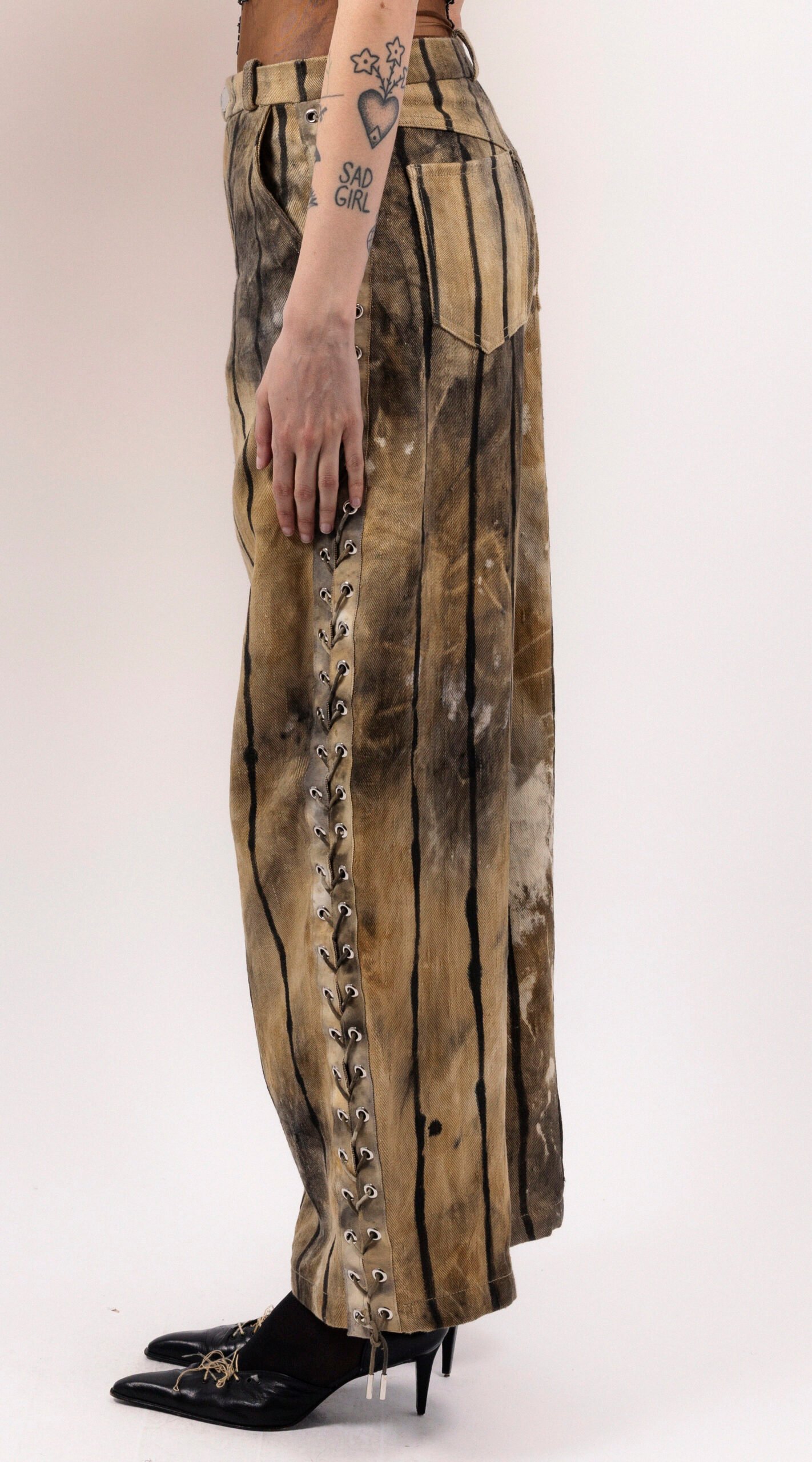 Wide-leg trousers in heavyweight hemp, hand-dyed with natural pigments and accented with hand- painted black strokes. Features a navy grosgrain side lace-up with eyelets, straight waistband with belt loops, front tailored pockets, and back patch pockets. Fastens with a zipper and irregular silver-tone button.