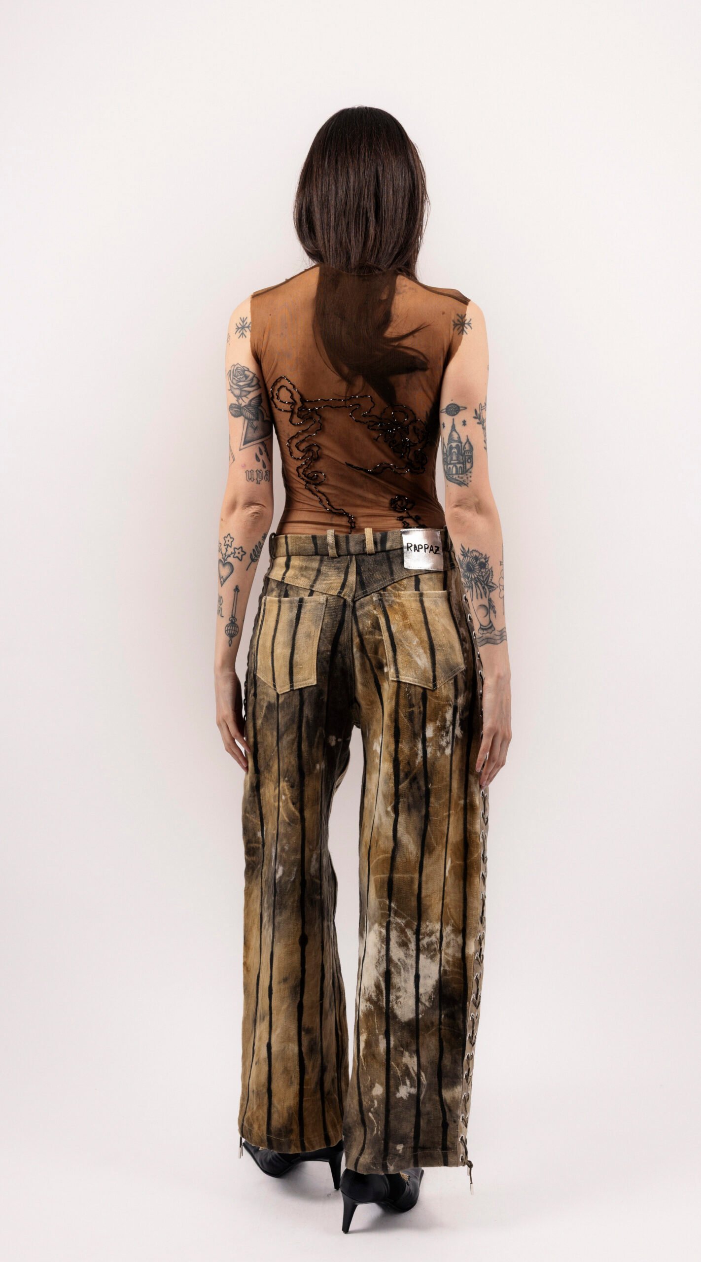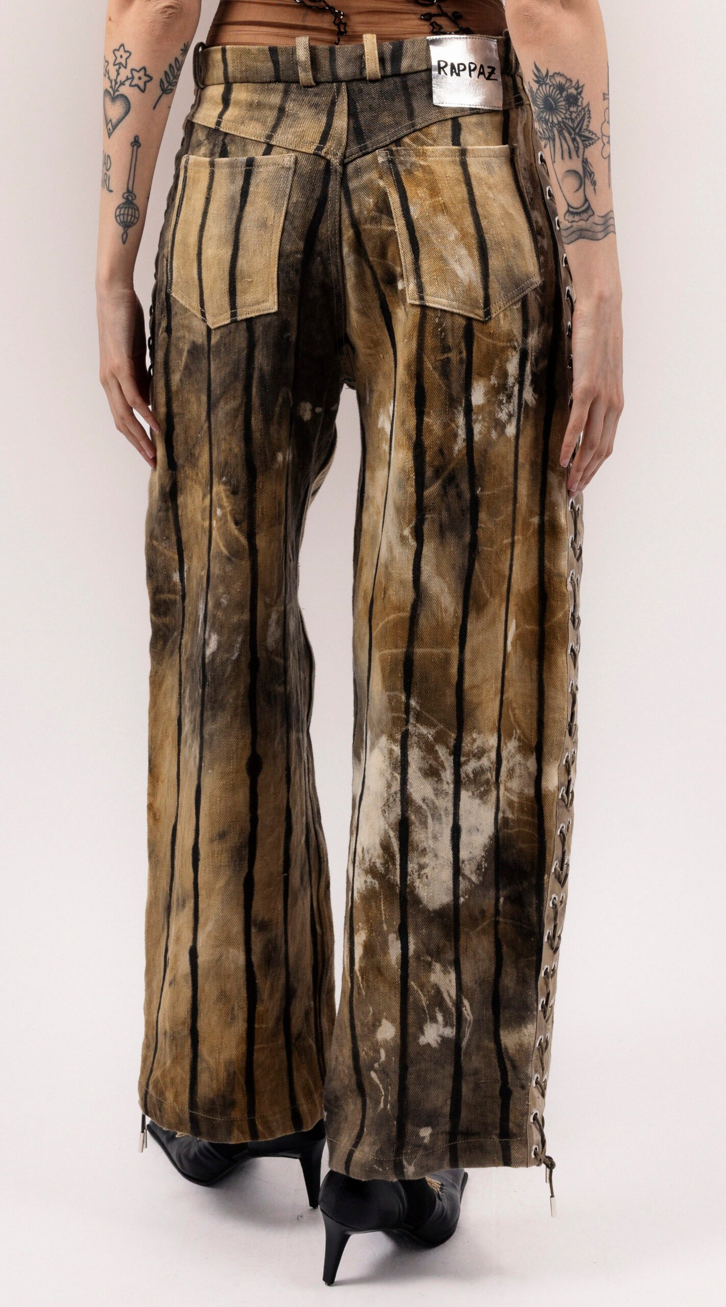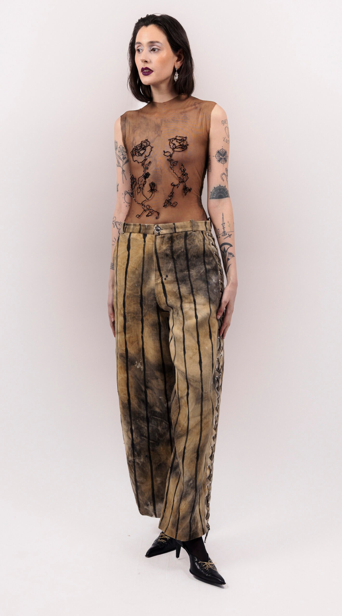 Wide-leg trousers in heavyweight hemp, hand-dyed with natural pigments and accented with hand- painted black strokes. Features a navy grosgrain side lace-up with eyelets, straight waistband with belt loops, front tailored pockets, and back patch pockets. Fastens with a zipper and irregular silver-tone button.