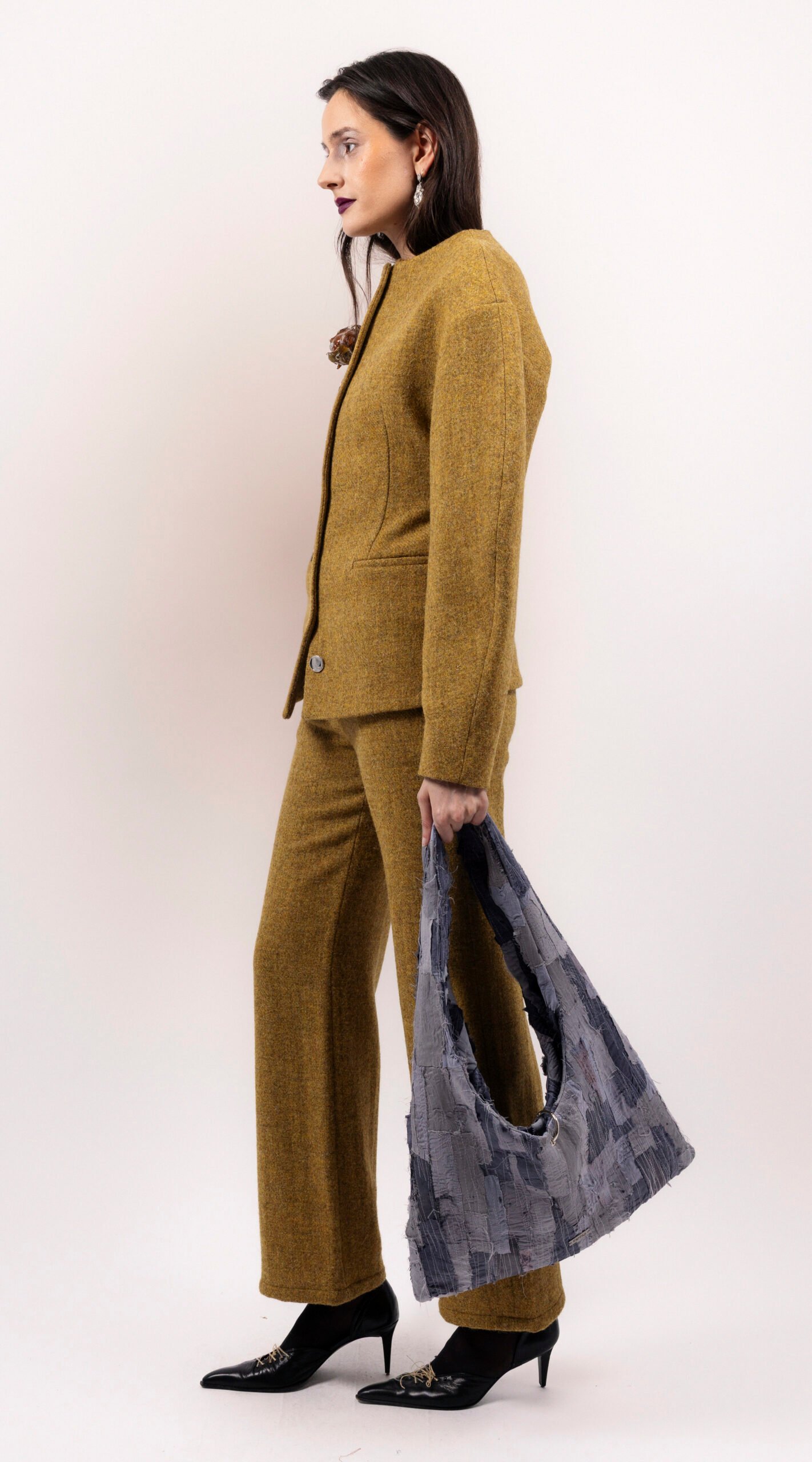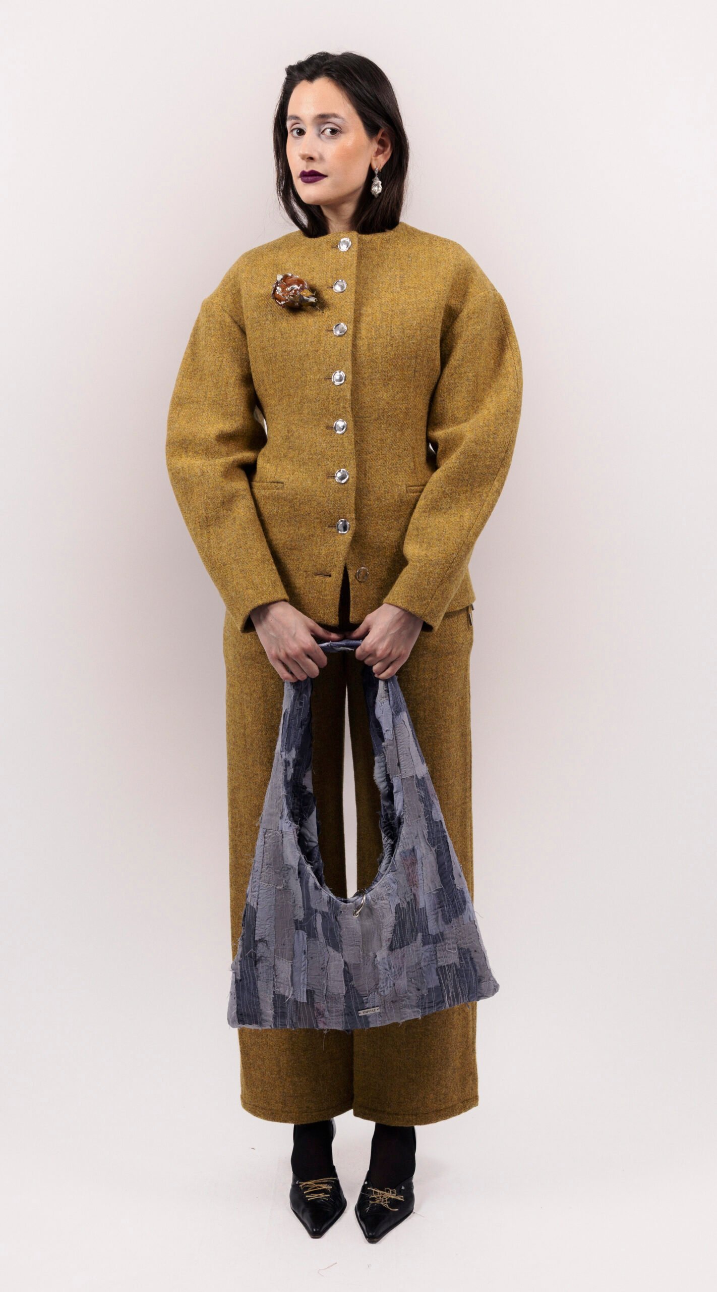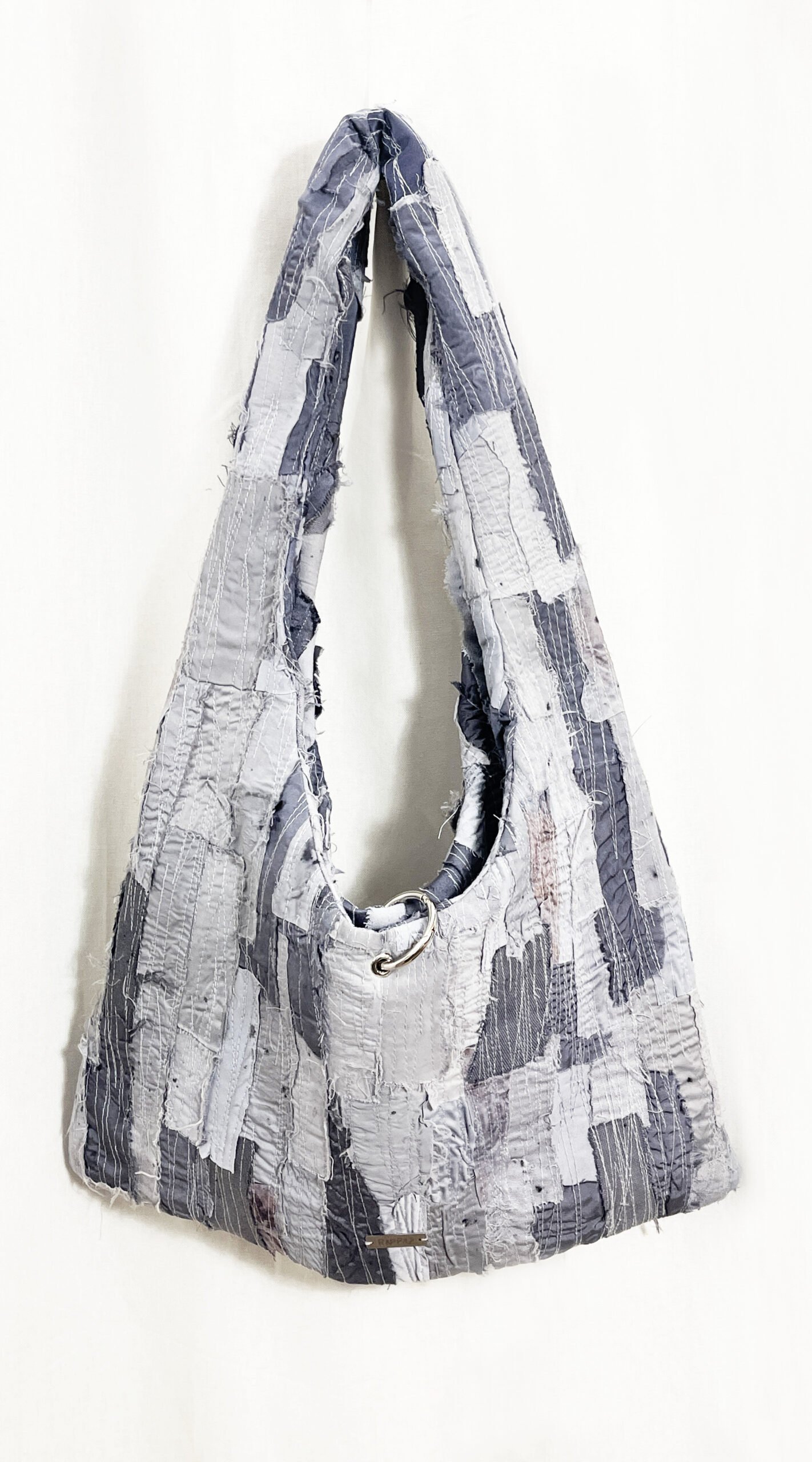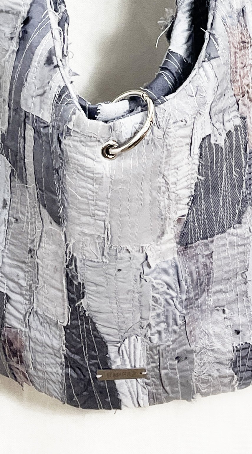 Purple/grey patchwork bag, medium size, with an interior pocket. Handcrafted from a mix of recycled and embroidered materials.