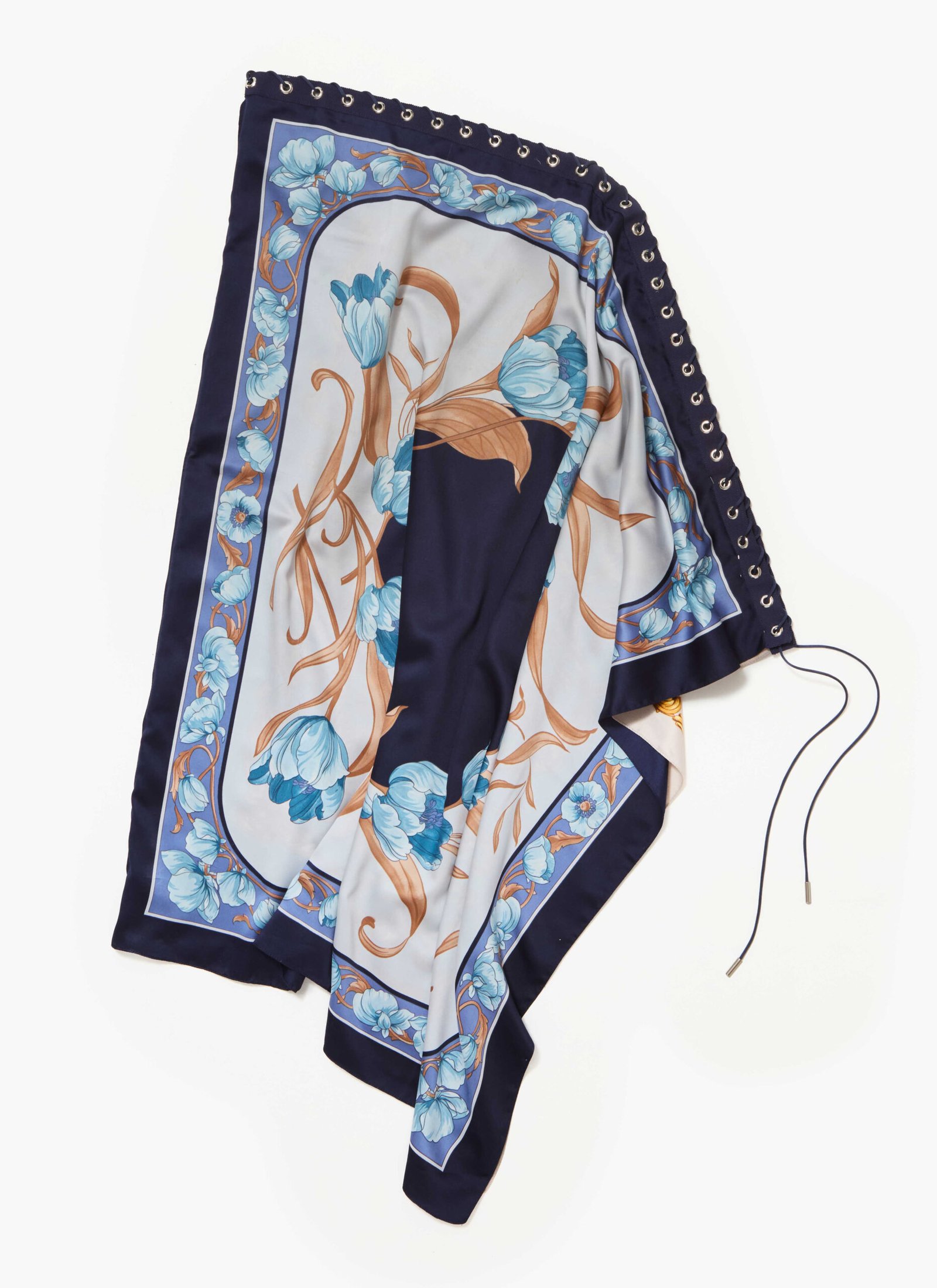 is embellished with a grosgrain ribbon with eyelets, edging and laces. Each scarf is unique, guaranteeing its