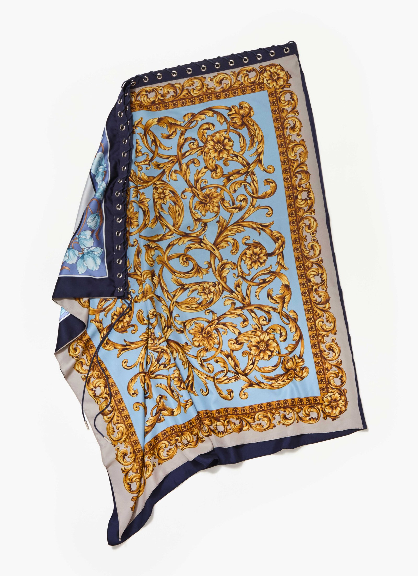 The skirt is made from vintage silk squares sourced from vintage boutiques. It features two navy prints. It