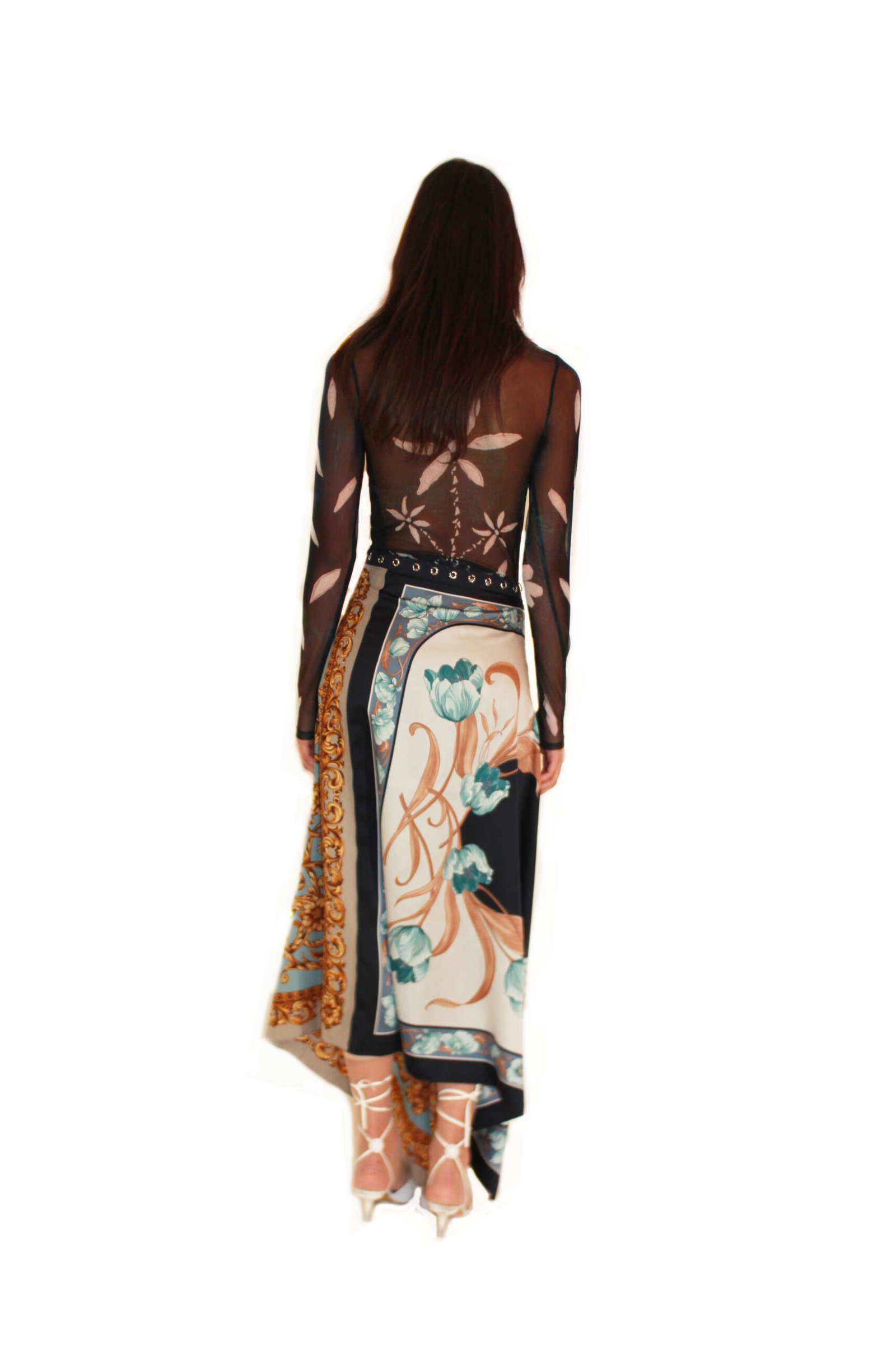 The skirt is made from vintage silk squares sourced from vintage boutiques.
